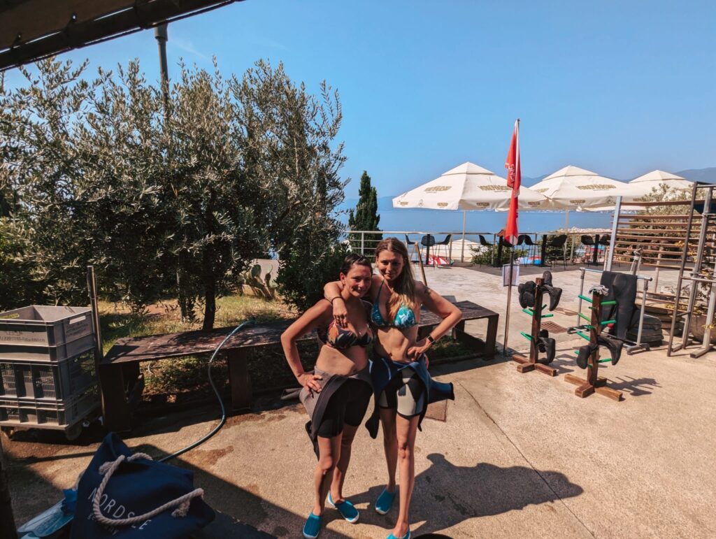 Zwei blonde Freundinnen sind mit dem Fahrrad